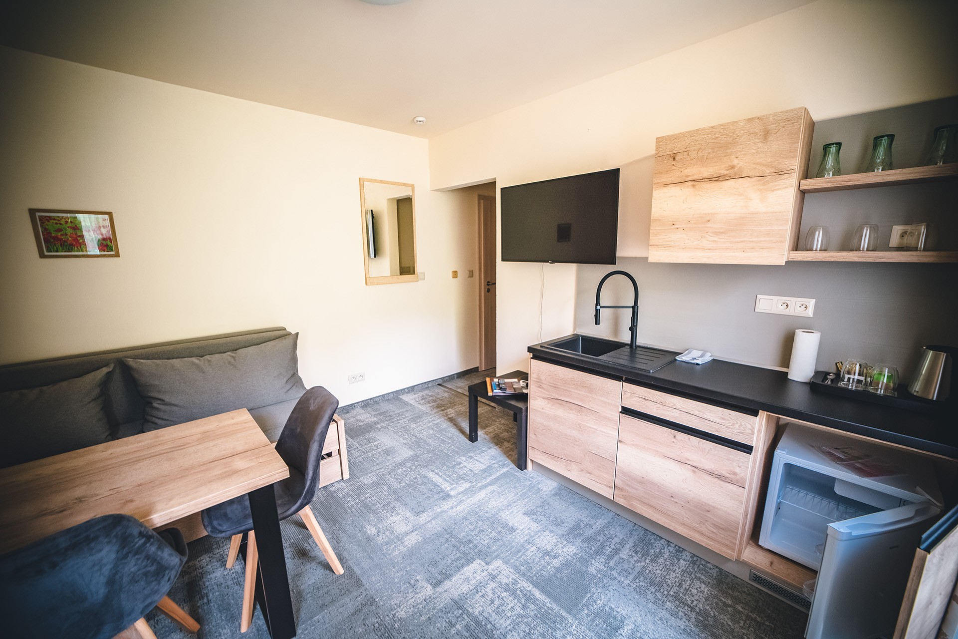 Všetky apartmány majú TV, kuchynky nie sú určené k vareniu, sú však vybavené chladničkou, varnou kanvicou, mikrovlnou rúrou, pohármi. |